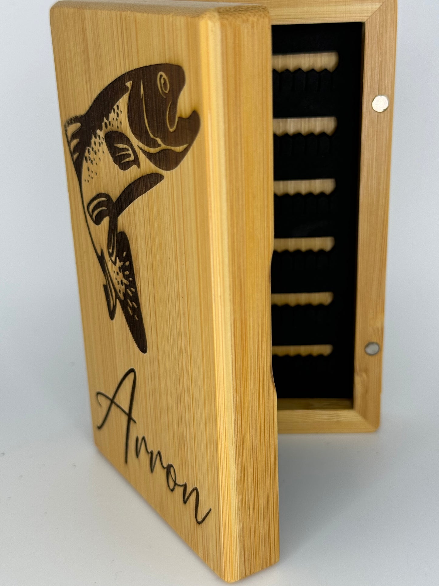 These Blank 135x85mm Bamboo fly boxes engrave really nicely. They are foam lined for 168 flies. Very popular seller on our etsy store.